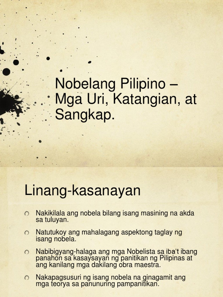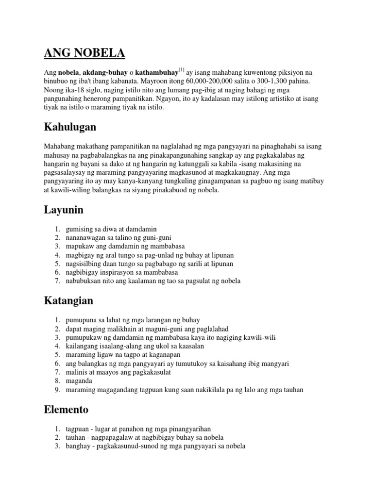 Make a copy Learn about Prezi. Katangian ng Nobela tauhan nagpapagalaw at nagbibigay buhay sa nobela banghay pagkakasunud-sunod ng mga pangyayari sa nobela Pananaw panauhang ginagamit ng may-akda a. Ang nobela akdang-buhay o kathambuhay ay isang mahabang kuwentong piksiyon na binubuo ng ibat ibang kabanata.