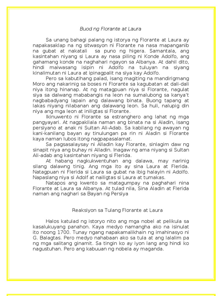 Florante at laura buod nobela. Ibong Adarna Buod ng Bawat Kabanata 1-46 with Talasalitaan Florante at Laura Buod ng Bawat Kabanata 1-30 with Talasalitaan Post navigation. Aralin 3 - Panaghoy ni Florante Saknong 26 - 40 Aralin 4 - Gunita ni Laura Saknong 41 - 68 Aralin 5 - Ang Mabunying Gerero Saknong 69 - 83 Aralin 6 - Salamin ng Reyno Saknong 84 - 97 Aralin 7 - Hinagpis ni Aladin Saknong 98 - 107 Aralin 8 - Walang Hanggang Paalam Saknong 108 - 125 Aralin 9 - Pagliligtas Kay Florante Saknong 126 - 142. Be the first to contribute.