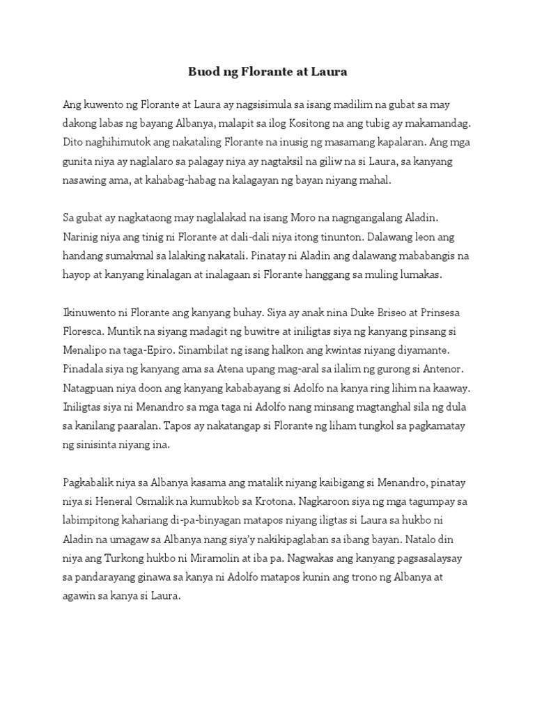 Buod ng Florante At Laura Sa isang gubat na madilim at mapanglaw sa may dakong labas ng Albanya malapit sa ilog Kositong makamandag ang tubig ay may isang lalaking nakagapos sa puno ng higera at kung titingnan ay kahabag-habag dahil sa sinapit nitong masamang kapalaran. Anong Anu-ano Anu-anong anyo aralin Atenas awit ayon bagong bait Balagtas bang bangis bawat bayang biglang binata binatang nakagapos BUOD NG NAKARAAN dahilan dalaga dibdib Diyos Duke dumating Flerida Florante at Laura ganito ganitong gerero gererong GINTONG HALAGAHAN gubat habag halimbawa halos. Reviews arent verified but Google checks for and removes fake content when its identified.