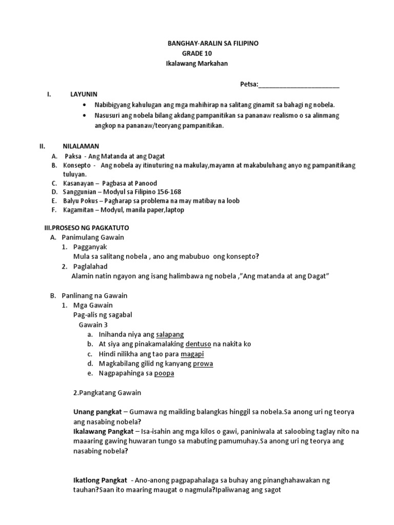 View FIL10 T2 PPT14 pdf from FIL 10 at Harvard University. Pagkatapos ng Ikasampung Baitang naipamamalas ng mag-aaral ang kakayahang komunikatibo mapanuring pag-iisip at pag-unawa at pagpapahalagang pampanitikan gamit ang teknolohiya at ibat ibang uri ng teksto at saling-akdang pandaigdig tungo sa pagkakaroon ng kamalayang global. Panganuhaing layunin ng Nobela.