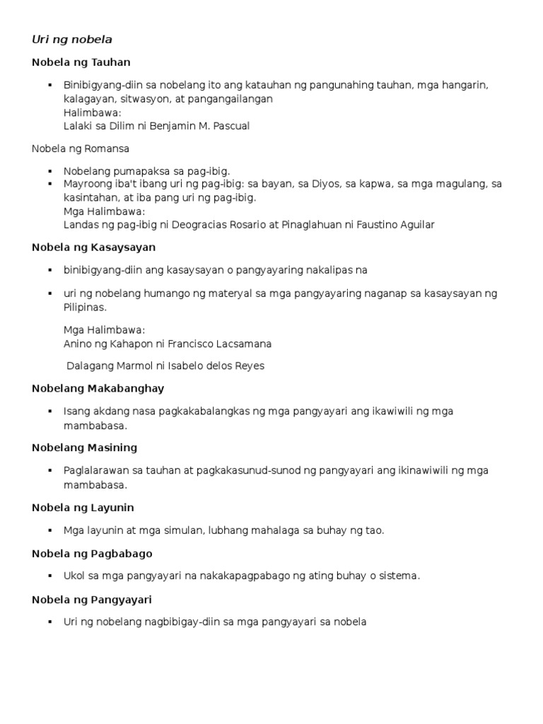 Karaniwang detalyado ang paglalarawan ng mga tauhan tagpuan at pangyayari. Sa pangkalahatan ang Nobelang Pilipino o Nobela sa Pilipinas ay ang mga nobelang nalimbag sa Pilipinas na inakdaan ng mga may-akdang Pilipino tungkol sa mga Pilipino at sa Pilipinas. Nobelang PasalaysayNobelang Romansa - ukol sa pag-iibiganKasaysayan - binibigyang-diin ang kasaysayan o pangyayaring nakalipas naNobelang Banghay - isang akdang nasa pagkakabalangkas ng mga pangyayari ang ikawiwili.