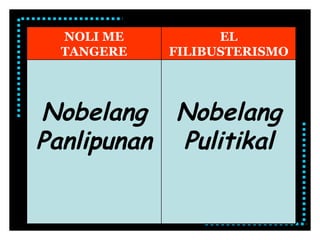 Paghahambing ng Noli Me Tangere at El Filibusterismo NOLI ME TANGERE EL FILIBUSTERISMO Huwag mo akong salingin Juan 2013-17 filibustero taong kalaban ng prayle o ng relihiyong Katolika Romana-Tumatalakay sa pamamahala ng mga Kastila sibil at simbahan Alay sa Inang Bayan Alay sa tatlong paring martir. Sinabi Ni Lopez Jaena na ang El Filibusterismo da w ay isang superior na Nobela kaysa Noli Me Tangere dahil meron itong magandang istilong pampanitikan meron daw itong magaan at tumpak na Dialogo at meron itong malinaw na mga parirala masigla din daw ito at elegante merong malalalim na. Ang Noli Me Tangere at El Filibusterismo ay mga nobelang sinulat ni Rizal na may paksang panlipunan at pampulitika.