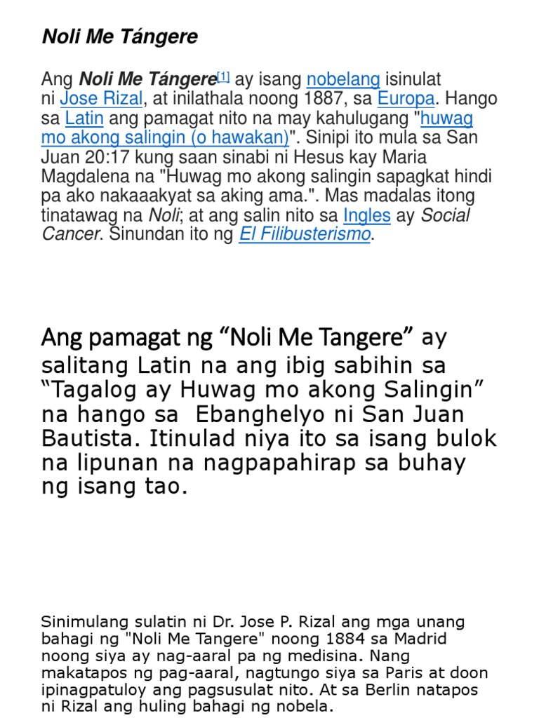 Tandaan sana na ang kahulugan sa Filipino ng pamagat ng Nobela ay HUWAG MO AKONG HIPUIN. Buod ng nobelang NOLI ME TANGERE ni Gat Jose P. Pansinin ang mga sumusunod Ang Pamagat na Noli Me Tangere ay nasa gitna mismo ng pabalat.